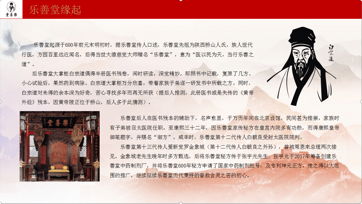 传承600年,让御医、御方、御药走入民间乐善堂传承600年,至今已15代人。自张宇光先生接过衣钵之后,致力于传承推广乐善堂御方御药,先后创办了乐善堂中药制剂有限公司、乐善堂中医门诊、乐善堂中药育苗育种基地、乐善堂国医大师工作室,并成立乐善堂企业管理集团有限公司,使乐善堂形成了一整套从御方传承、御药制作,到标准化中医药人才培养等,系统的、全面的中医药传承发展体系,并开创了中医馆共同体新模式,将更多的中医药传承者汇聚一堂,共同发力,用创新性的经营模式发扬中医药事业。