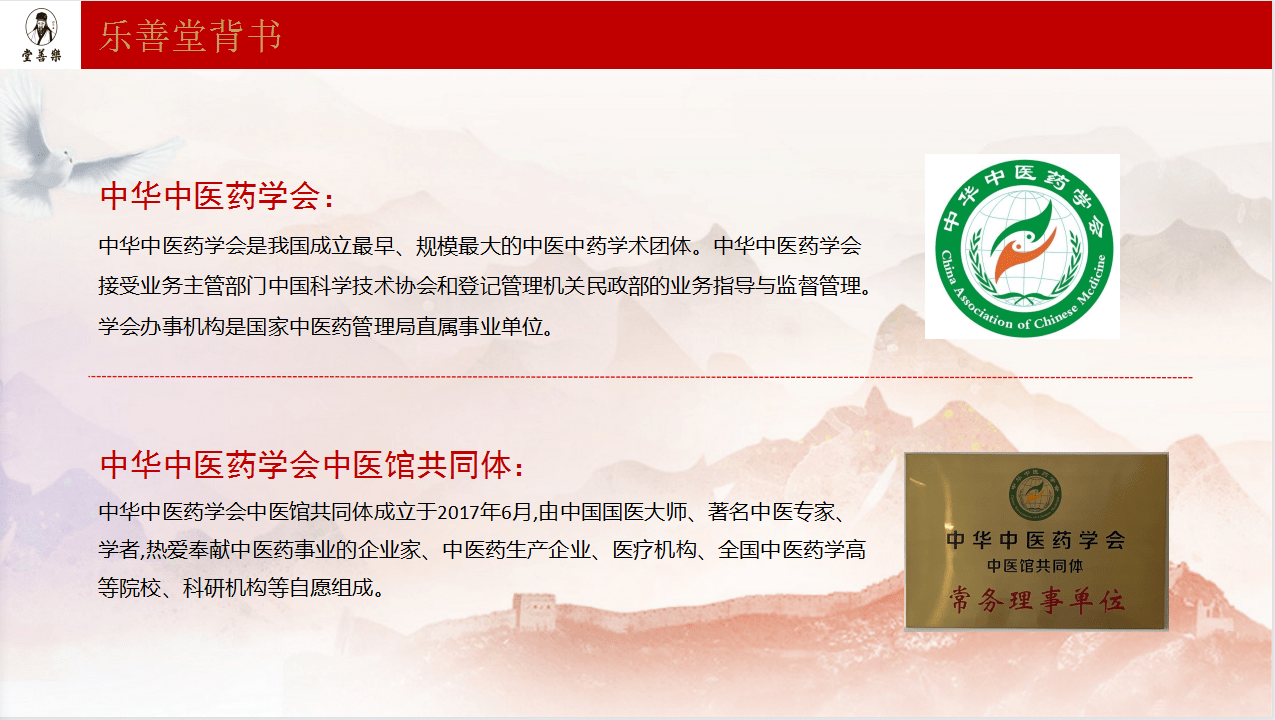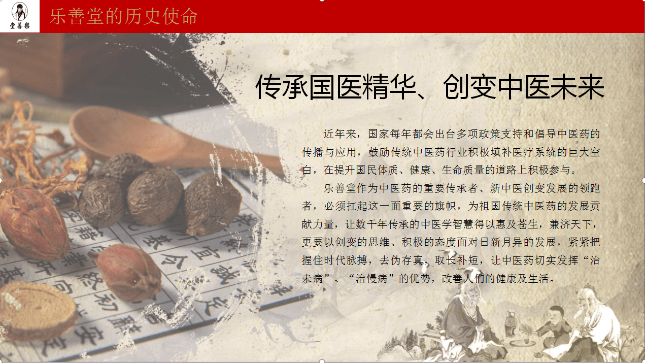乐善堂开创了中医馆共同体新模式,及时有效服务患者,提高中医医疗服务效率,传承中医文化,扩大中医药价值。紧跟国家对于中医药的发展政策,通过在线诊疗新技术支持中医,提升医疗、中医公共服务均等化、普惠化、便捷化。打造新时代中医药文化,励志把中医药推出国门走向世界不懈努力